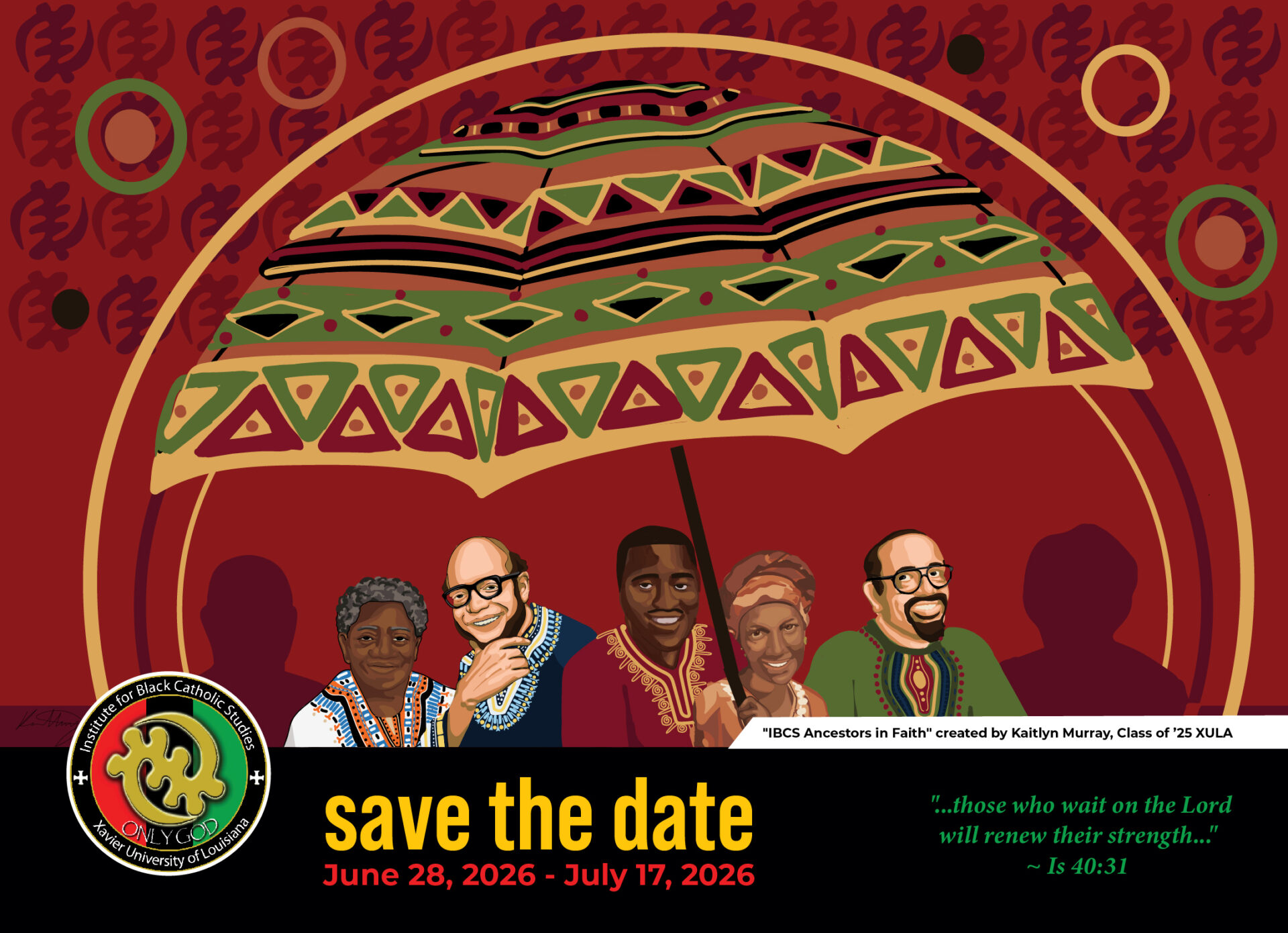 « All Events SAVE THE DATE: IBCS Summer 2026 Date Announced June 28 - July 17 « ORACLE Bible Study on Zoom ORACLE Bible Study on Zoom » The Institute for Black Catholic Studies has announced the date for the Summer 2026 program. The theme is “…those who wait on the Lord will renew their strength…” Isaiah 40:31 Add to calendar Google Calendar iCalendar Outlook 365 Outlook Live Details Start: June 28 End: July 17 Website: https://www.xula.edu/ibcs/ Venue Institute for Black Catholic Studies 1 Drexel Drive New Orleans, LA 70125 United States + Google Map View Venue Website