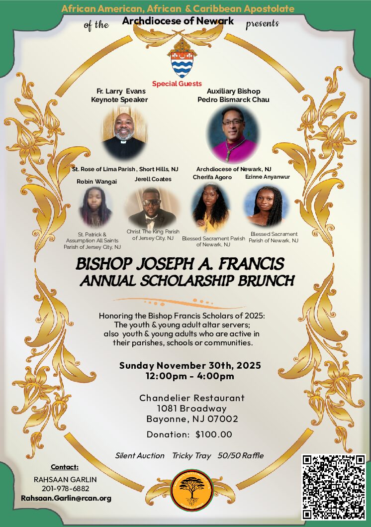 Chandelier Restaurant 1081 Broadway, Bayonne, NJ, United StatesHonoring the Bishop Francis Scholars of 2025, The youth & young adult altar servers, and also youth and young adults who are active in their parishes, schools or communities. Presented by the African American, African & Caribbean Apostolate of the Archdiocese of Newark. Contact: Rahsaan Garlin at 201-978-6882 or Email: Rahsaan.Garlin@rcan.org