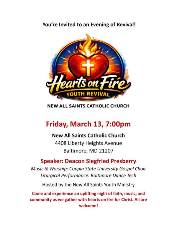 New All Saints Catholic Church 4408 Liberty Heights Avenue, Baltimore, MD, United StatesYou're invited to an Evening of Revival! Friday, March 13, 2026 at 7:00 PM EST New All Saints Catholic Church 4408 Liberty Heights Avenue Baltimore, MD 21207 Speaker: Deacon Siegfried Presberry Music & Worship: State University Gospel Choir Liturgical Performance: Baltimore Dance Tech Hosted by the New All Saints Youth Ministry Come and experience an […]
