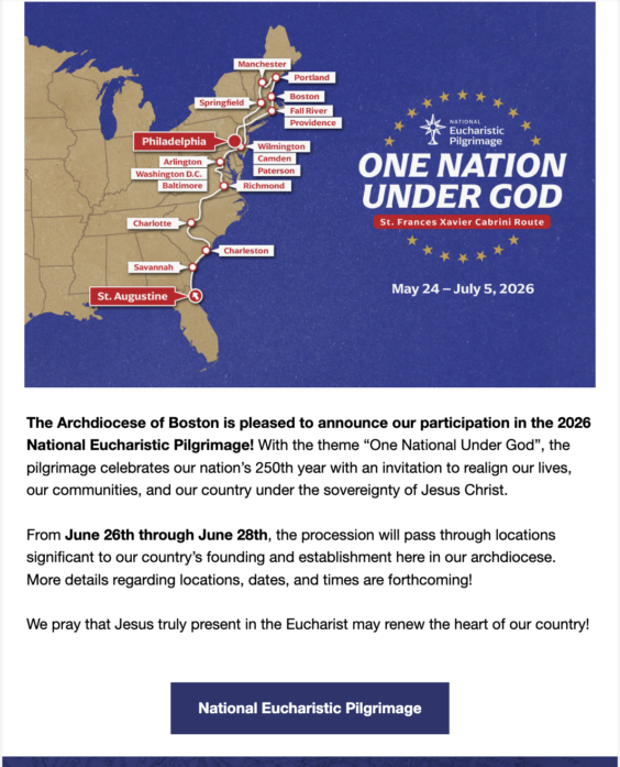 The Archdiocese of Boston is pleased to announce our participation in the 2026 National Eucharistic Pilgrimage! With the theme “One National Under God”, the pilgrimage celebrates our nation’s 250th year with an invitation to realign our lives, our communities, and our country under the sovereignty of Jesus Christ. From June 26th through June 28th, the procession will […]