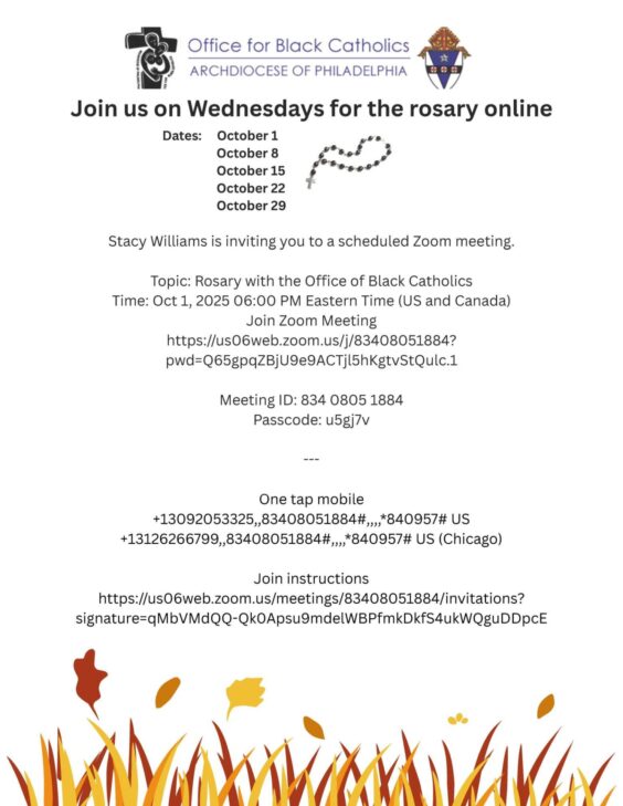 Zoom Virtual EventThe Office for Black Catholics of the Archdiocese of Philadelphia is hosting a virtual rosary every Wednesday in October beginning at 6:00 PM Eastern. https://us06web.zoom.us/j/83408051884pwd=Q65gpqZBjU9e9ACTjl5hKgtvStQulc.1 Meeting ID: 834 0805 1884 […]