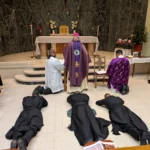 Pictured from left: Josephite seminarians Charles Nwamadi, Chidiebere Dominic, and Linus James lay prostrate during…